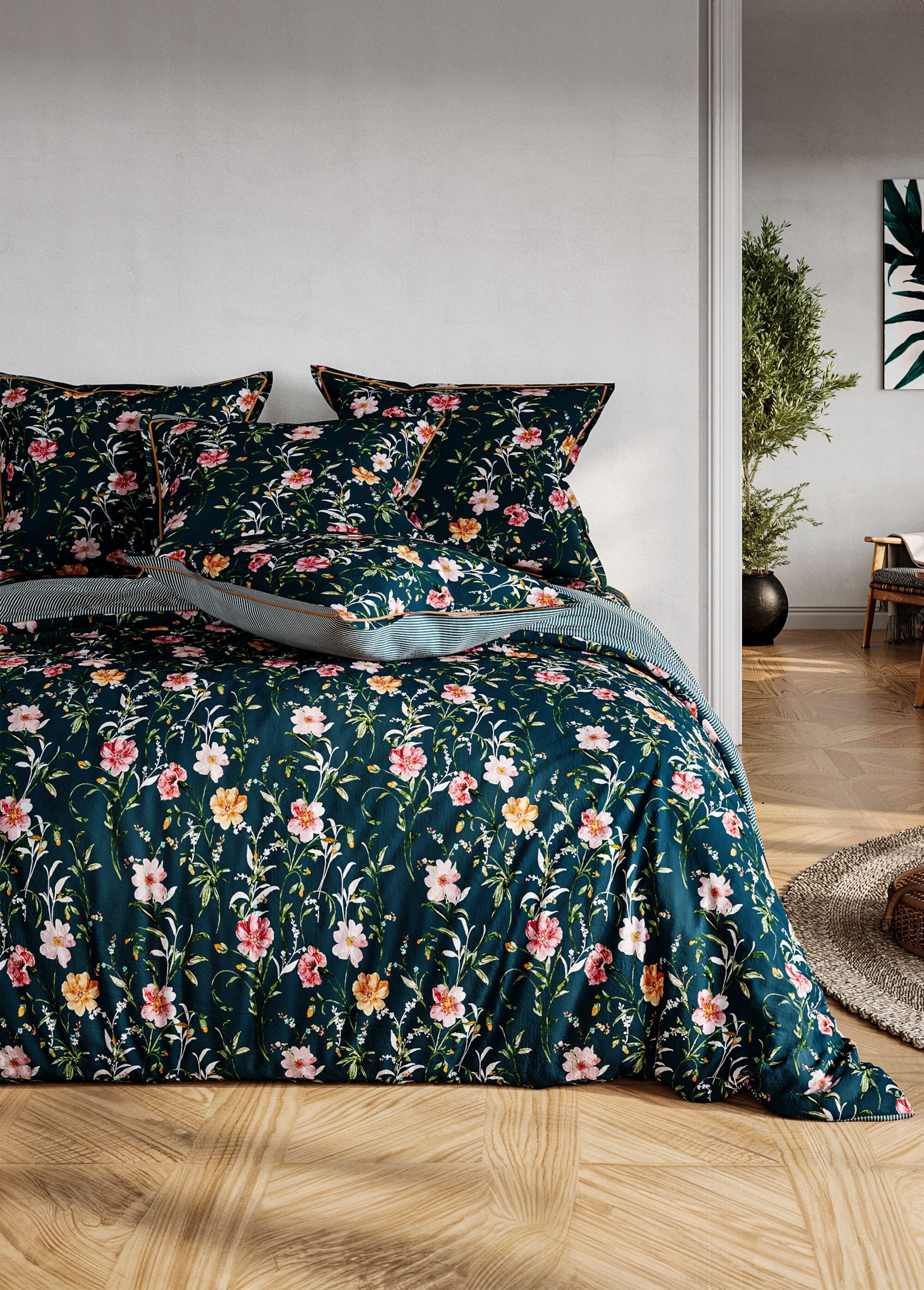Bedding sets come in a variety of styles and patterns to enhance any bedroom. Whether you prefer solid colours or delicate patterns, each set can transform the feel of a room. Collections in cotton percale, cotton sateen or cotton gauze combine comfort and aesthetics. The fitted sheets, flat sheets and duvet covers available in these ranges ensure a quality night's sleep. For children's beds, sets with playful and colourful patterns are also available, creating a welcoming room for the little ones.