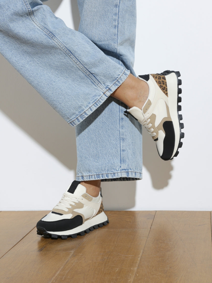 These multi-material wedge sneakers are the perfect choice for those who want to combine comfort and style. With their wide, chunky lugged soles, they offer a dynamic look while ensuring good grip. The glittery details and gold crackle effect add a touch of glamour, making every step unique and on-trend. Whether for a casual outing or a day at the office, these sneakers are perfect for any occasion. They pair easily with a multitude of outfits, adding a chic and modern touch to your look. Dare to wear them and let your personality shine through with this bold choice.