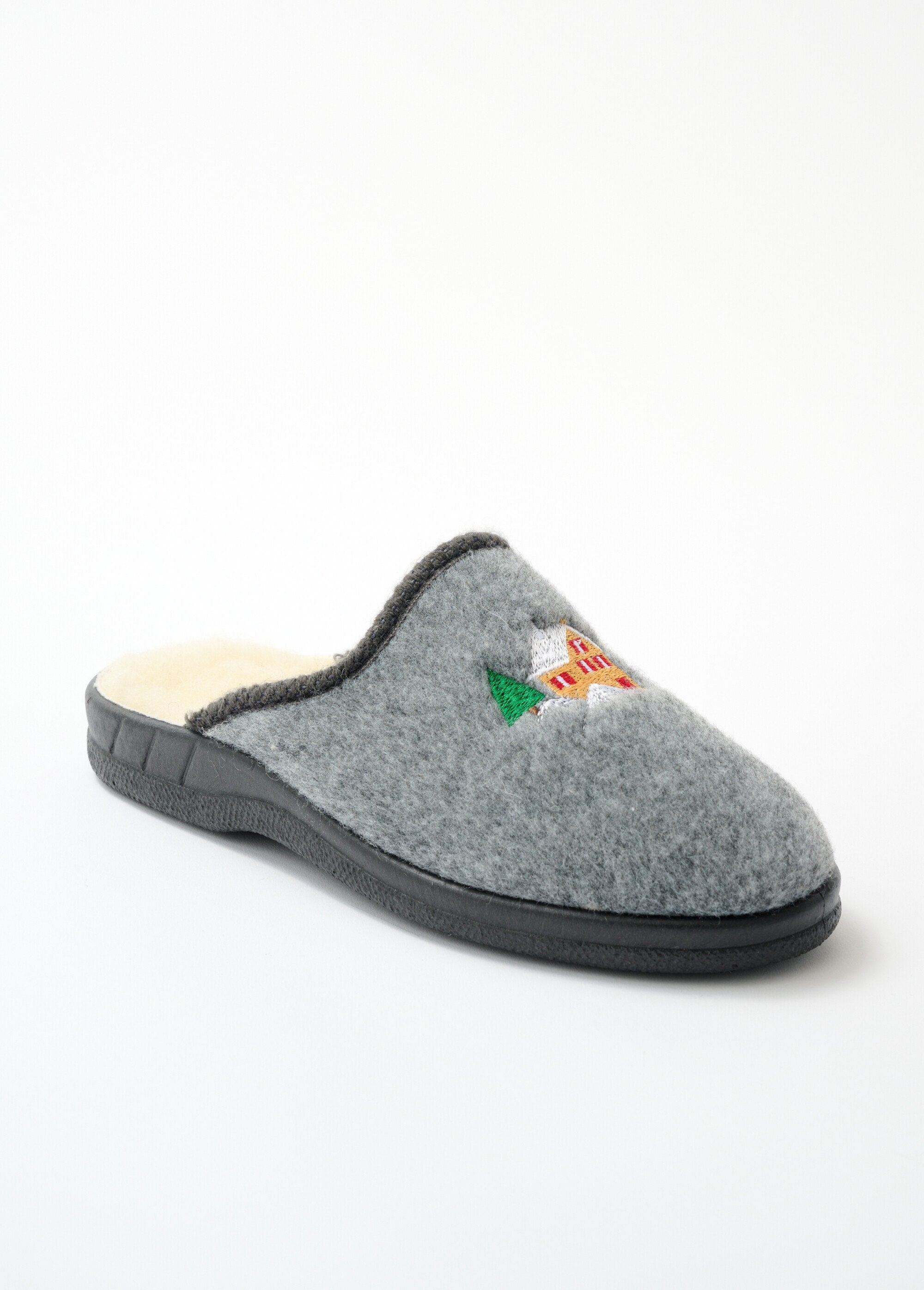 Warm and well-fitting, the mule offers cozy comfort. Spacious fit, comfortable width. Embroidery placed on the top. Bias finish.