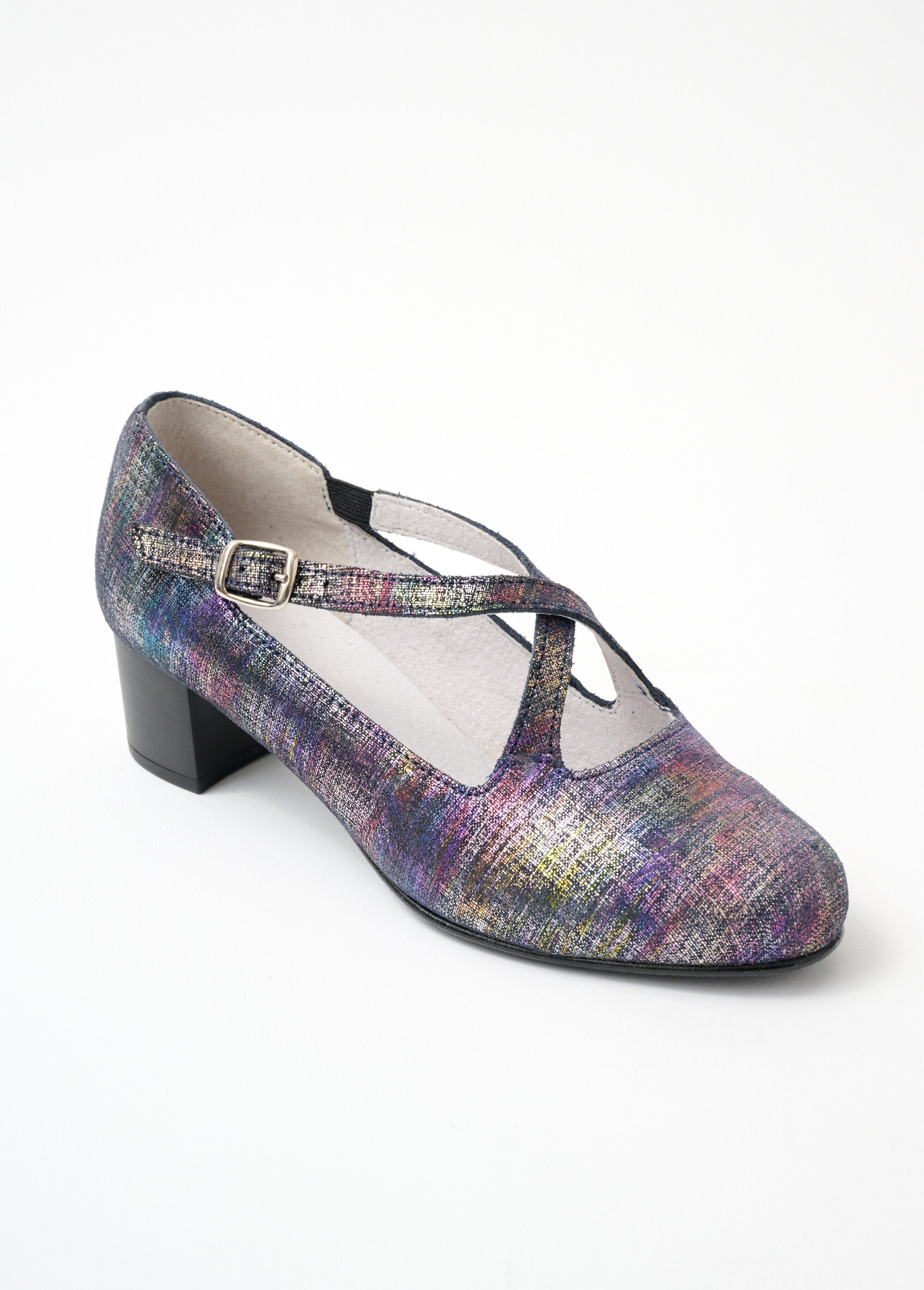 Rediscover the pleasure of walking with a women's pump with sparkling chic and soft comfort. Crossed straps on the foot adjustable by buckle. 1 strap and buckle mounted on elastic.