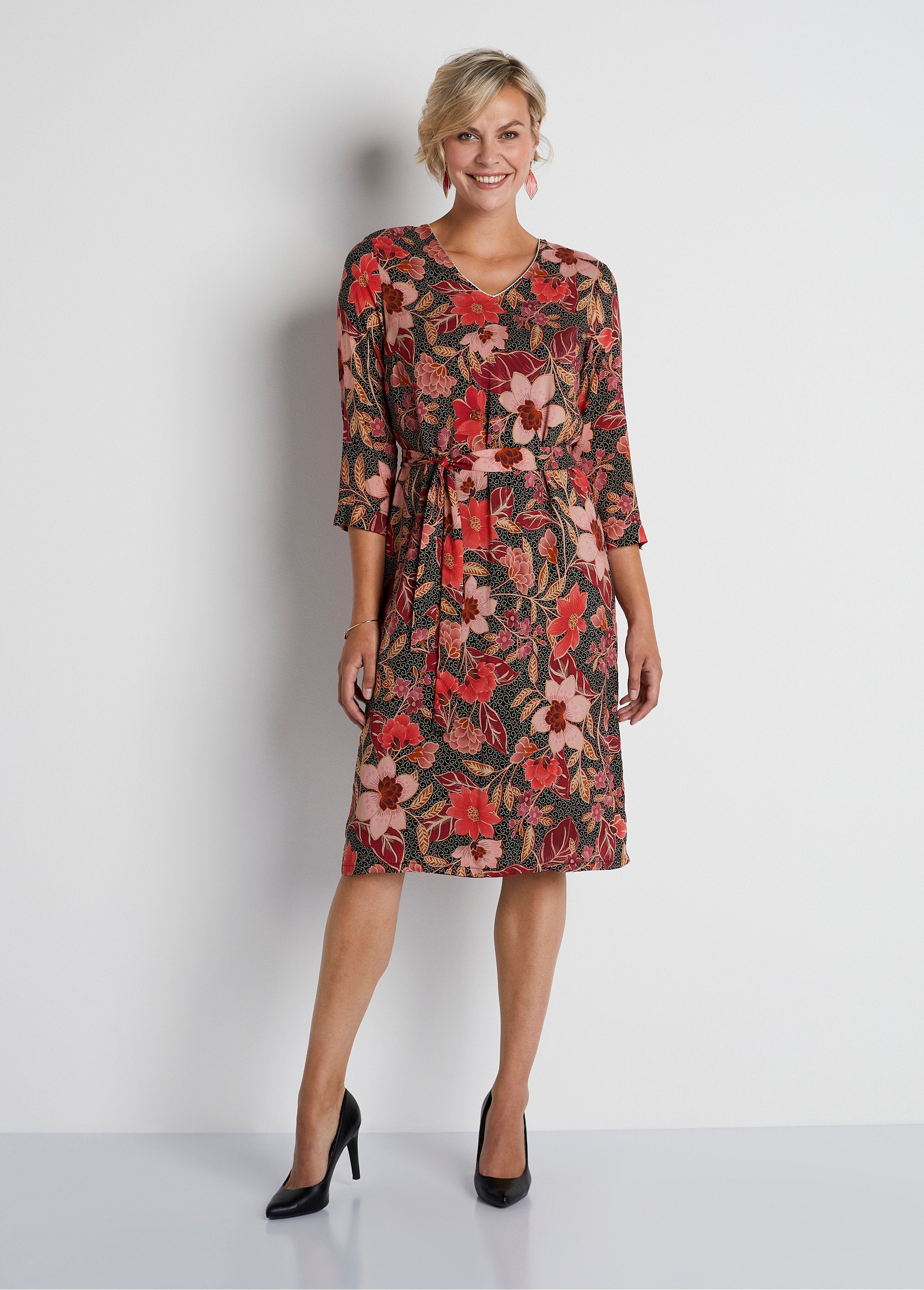 Bright floral print, straight cut and soft fluidity... The cover dress ensures femininity. Iridescent bias at the V-neck. Small slit at the bottom of the 3/4 sleeves and at the hem. Removable belt in the same fabric to tie under loops. French made.