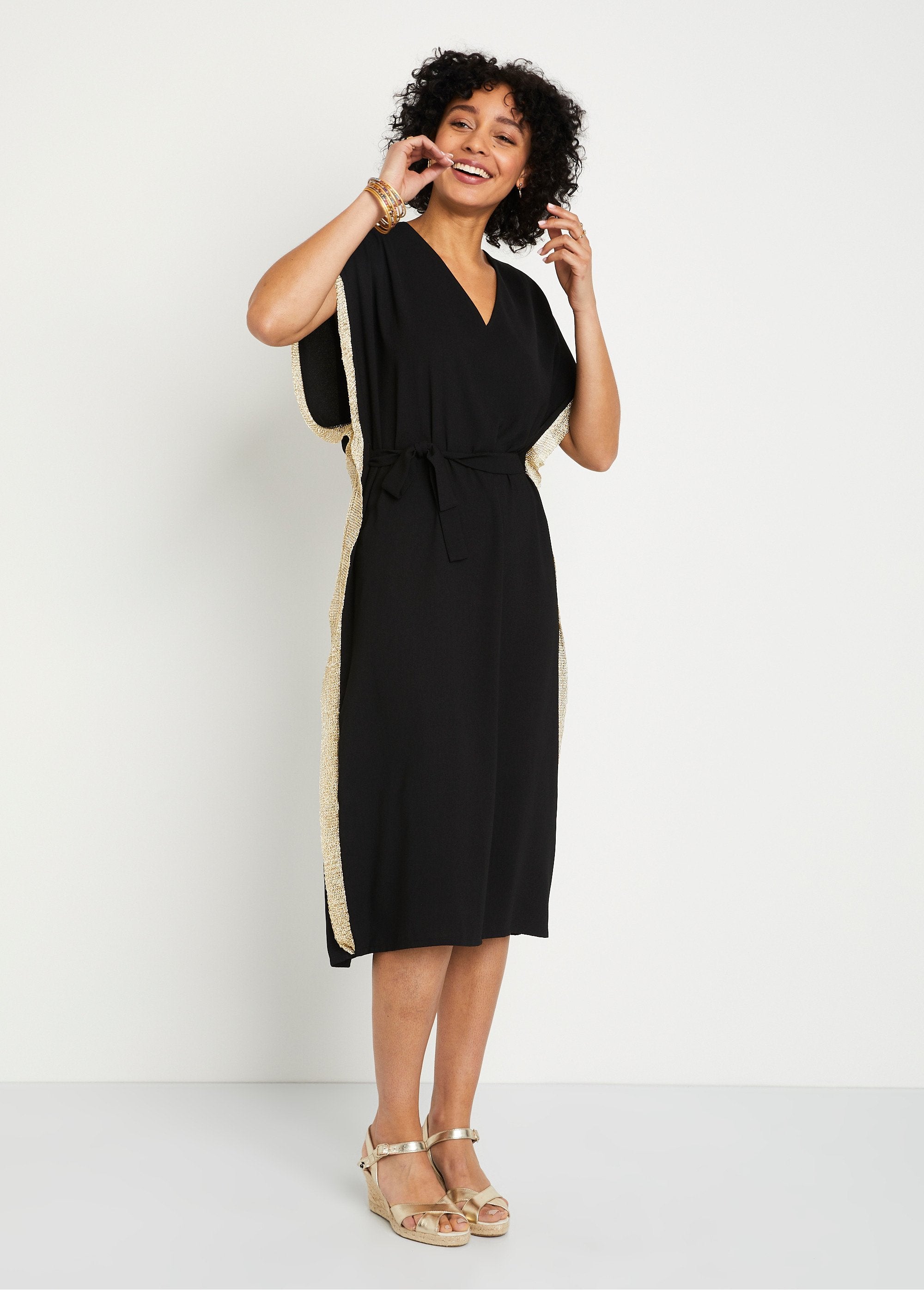 Suitable for both small and large sizes, the dress offers a unique look with a sober cut... But which is noticeable! Its kimono volume, without armholes, allows to nicely cover the upper arms. Its loose line is accompanied by a removable belt of the same fabric, to tie. Its V-neck highlights the neck and its gold braid finish brings just the right touch of fantasy. Made in France.